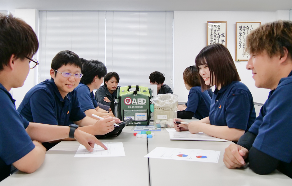 三笠電機では、30代以下の若手社員を中心に「自分たちの手で未来を変えていく」という想いから、社内にSDGs推進チームを発足。チームで話し合った提案は管理職会議にも上げられ、実際に制度や運用にも反映されています。 たとえば、環境負荷の少ないリサイクル可能な作業着への切り替えや、ペットボトルキャップの回収、AEDの設置など、日々の小さな行動から持続可能な社会の実現に貢献しています。