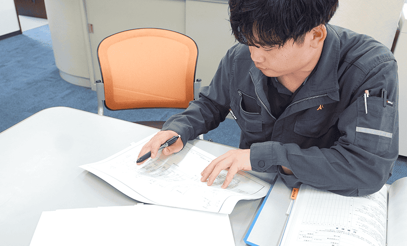 現場事務所での図面、書類等の作成、現場状況の確認を行います。